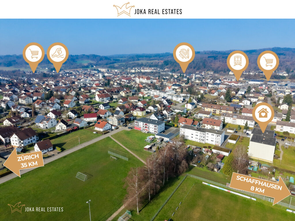 Jestetten ist eine lebendige Gemeinde im südlichsten Zipfel Baden-Württembergs, unmittelbar an der Schweizer Grenze gelegen. Die Nähe zu Schaffhausen – nur wenige Kilometer entfernt – sowie die ausgezeichnete Anbindung an Zürich machen den Standort besonders attraktiv, nicht zuletzt für Berufspendler in die Schweiz.